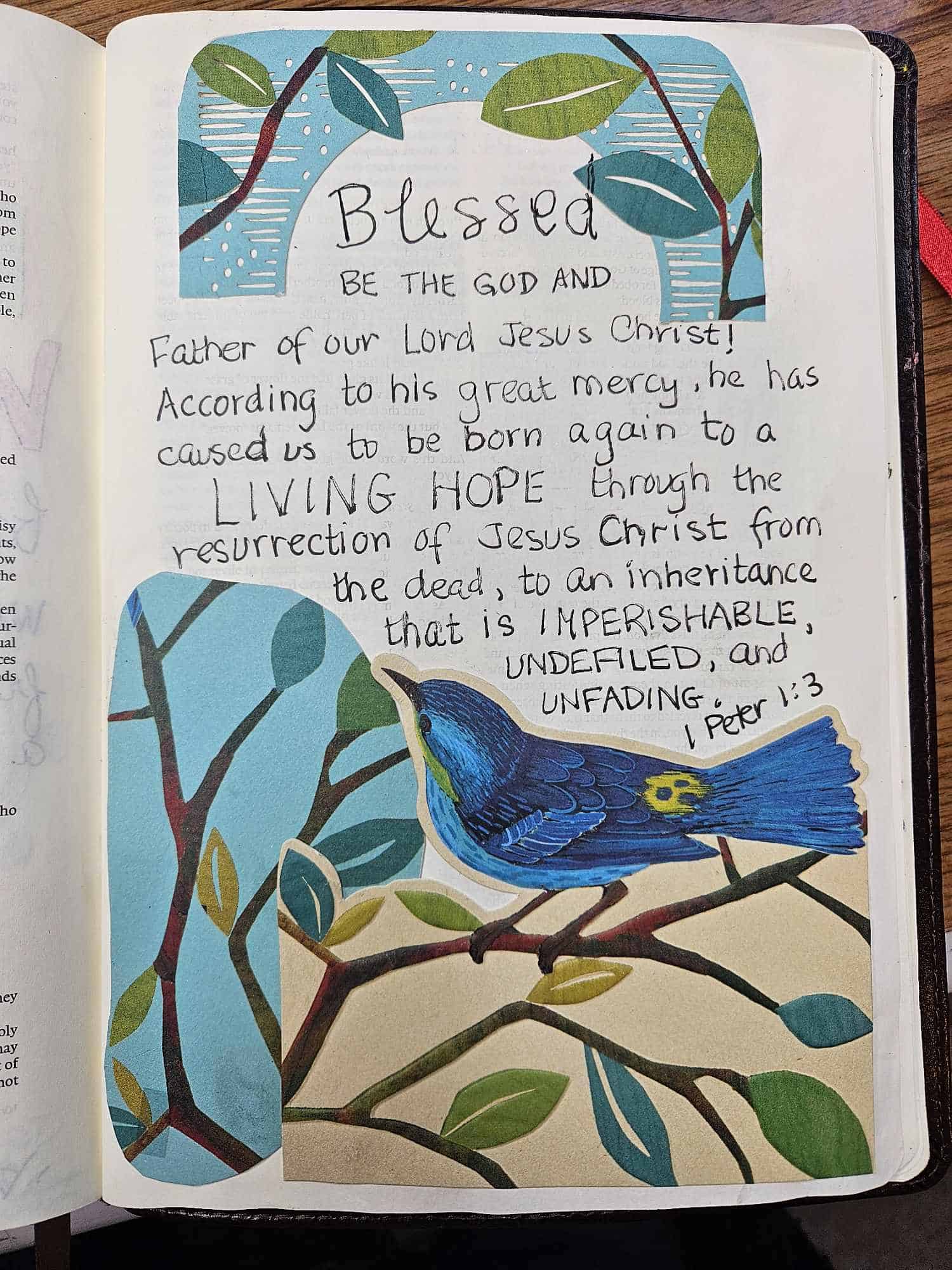 This example of journaling art uses a page from an old planner with the verse written on paper and glued into my Interleaved ESV Journaling Bible. Easy peasy for the artistically challenged!!