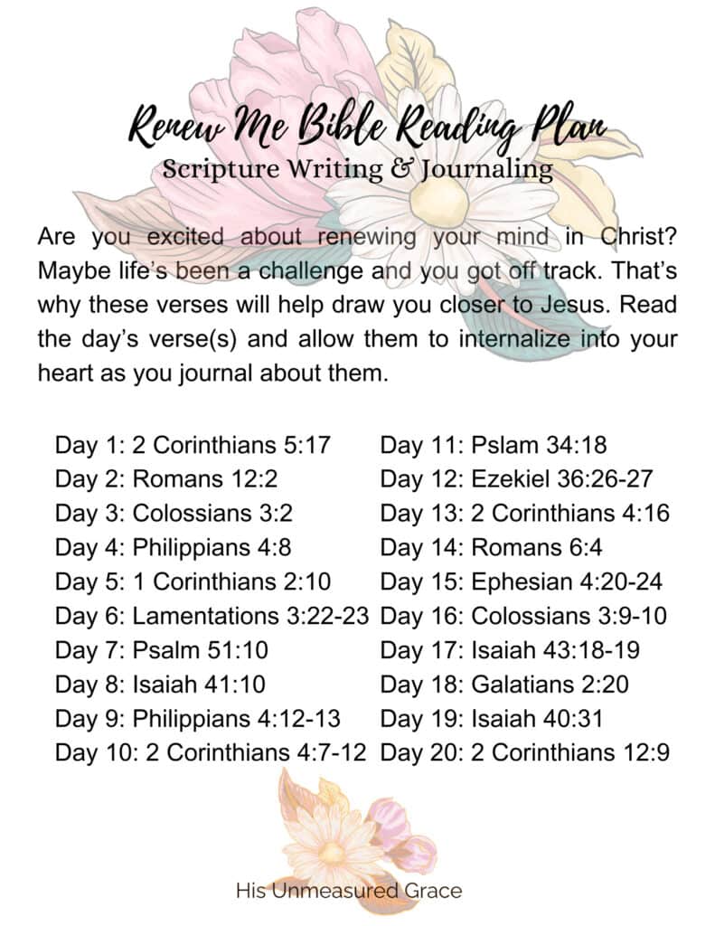 Discover the transforming power of God’s Word with the Renew Me Bible Reading Plan! This 20-day plan is designed to guide you through carefully selected Bible verses for Scripture writing and study, helping you focus on renewing your heart, mind, and spirit in Christ.